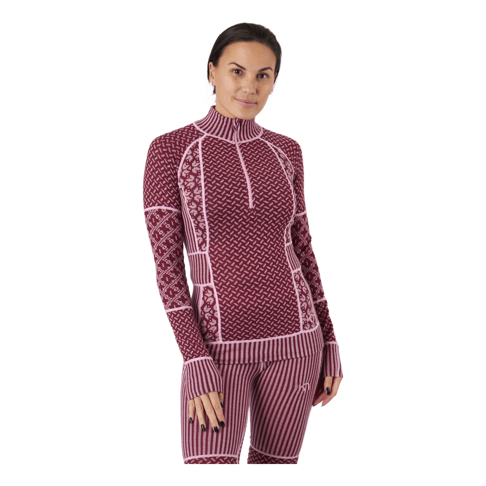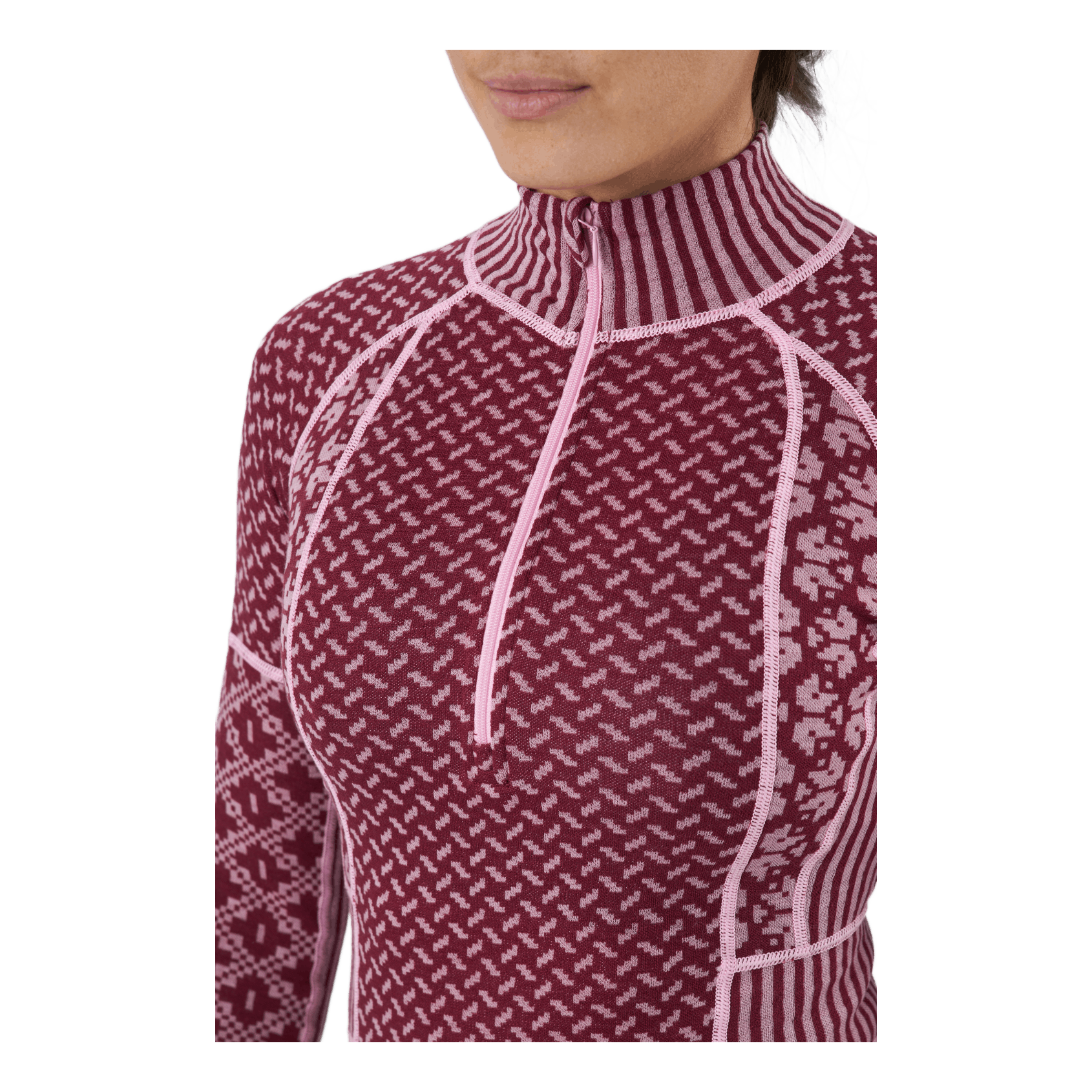 "The Kari Traa Smekker Half-Zip is a lightweight, 100% Merino wool women’s baselayer top. Naturally breathable and odor-resistant, wool keeps you warm whether it’s wet or dry and feels great against your skin. Flatlock seams turn up the comfort level when you turn up the heat. And if things get too hot, you can zip down the high collar. Panels of Jacquard-knit patterns in different intensities create flattering lines."