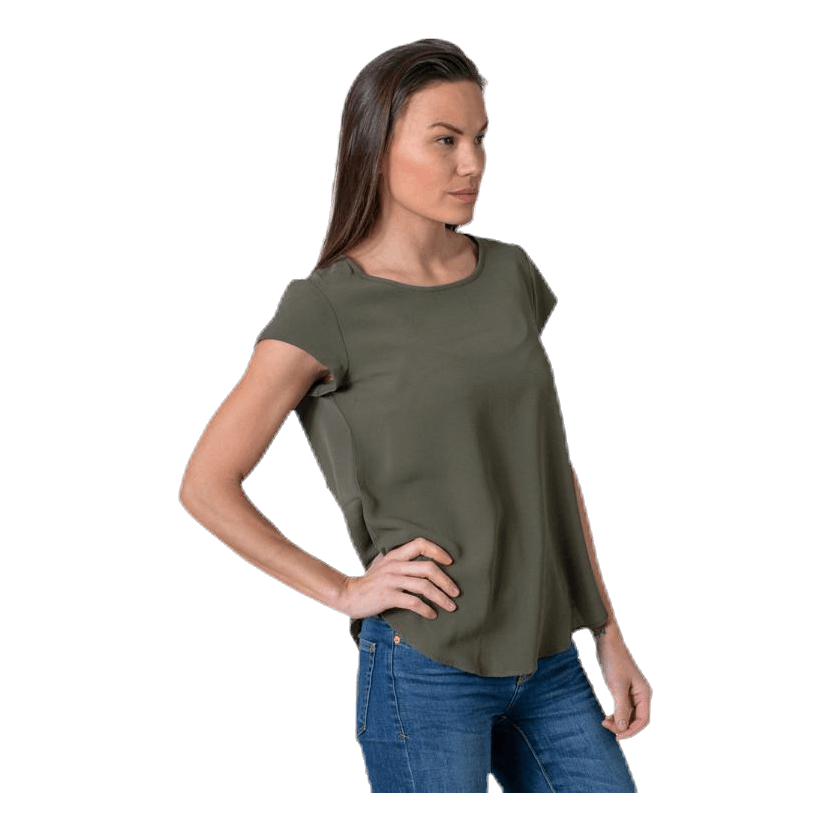 Rak modell med korta ärmar och vid halsringning med smal bandkant och silverfärgad dragkedja i halsen. Rundad nederkant som ligger längre bak. Vävd crepekvalitet med stretch.